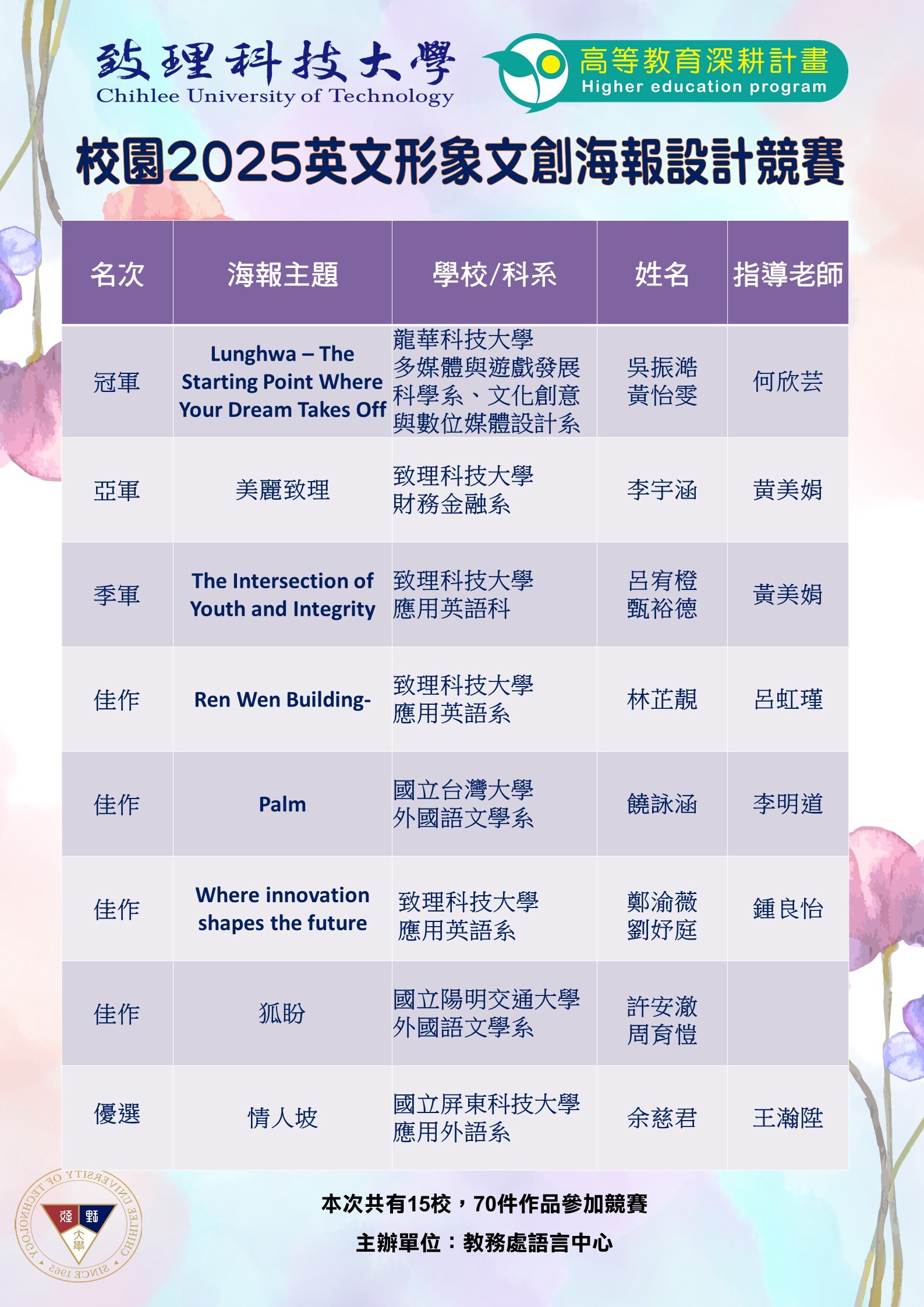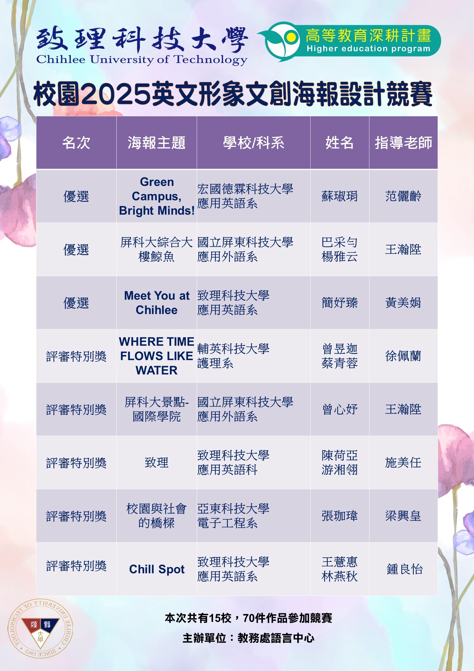 本次英文校園形象文創海報設計競賽,共計15間學校、70件海報作品參賽,感謝各校踴躍投稿。由於報名踴躍,